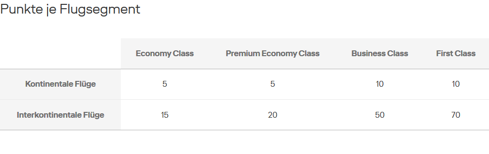 In Abhängigkeit der gewählten Reiseklasse und abhängig davon, ob es sich um einen kontinentalen oder interkontinentalen Flug handelt, erhalten Sie eine bestimmte Anzahl an Punkten bzw. qualifizierenden Punkten.