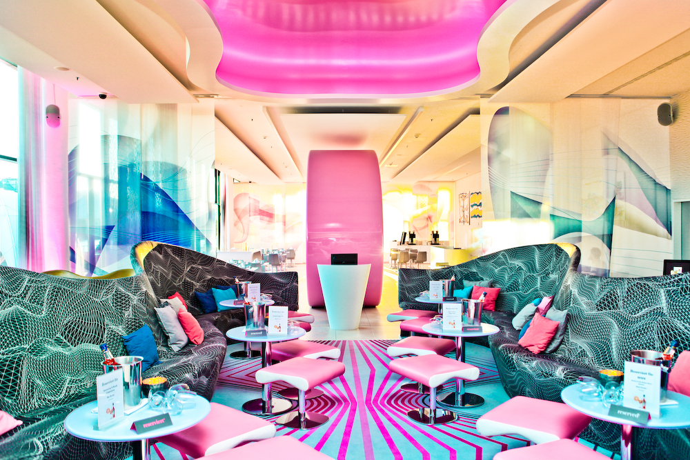 Gewinner nach vorn: Das fröhlich-poppige Design aus der Feder von Karim Rachid ist bunt, schräg und macht Laune mit seinen pinkfarbenen Akzenten. Die Farbwelt zitiert die Pop-Art, die organische Formensprache erinnert an die zerfließenden Uhren von Dali. Schräges Detail: die Fernseher auf den Zimmern sind in Wandspiegel integriert und ausgeschaltet unsichtbar.