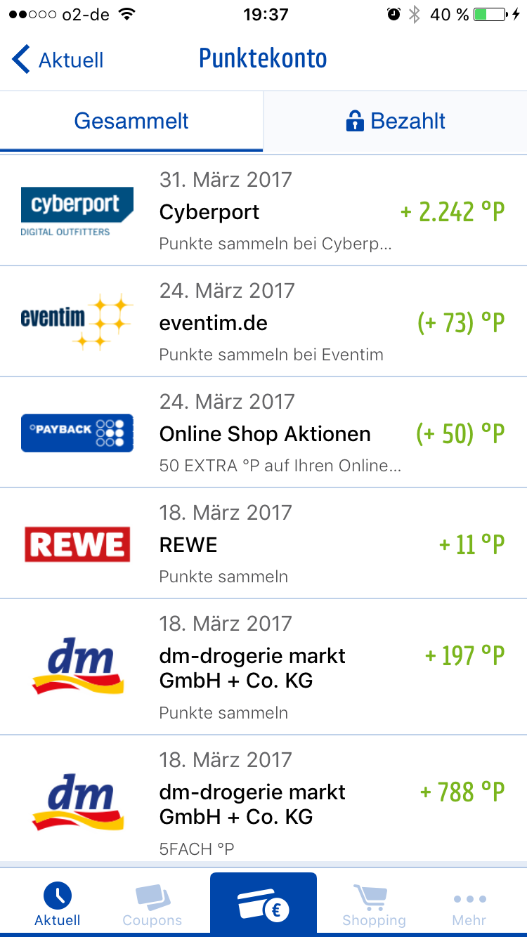 Der Kauf bei Cyberport ist leider mit Schwierigkeiten verbunden. Obwohl er im Februar getätigt wurde, waren Ende März die Punkte immer noch nicht auf meinem Kontoauszug zu sehen woraufhin ich mit dem Serviceteam in Kontak getreten bin. Am 31. März wurden 2.242 Punkte gutgeschrieben. Das ist leider nur ein Bruchteil der 12fach Promotion gewesen, es fehlen noch mehr als 20.000 Punkte auf dem Konto. Aufgrund der Höhe der zu erwartenden Punkte hatte ich beim Kauf jedoch vorsorglich Screenshots gemacht. Ich werde Payback noch eine Mail schreiben müssen. Die (noch) fehlenden Punkte würden mich dann ja bereits fast in die Business Class bringen, aber ich will ja sowieso mit Payback Punkten First Class fliegen