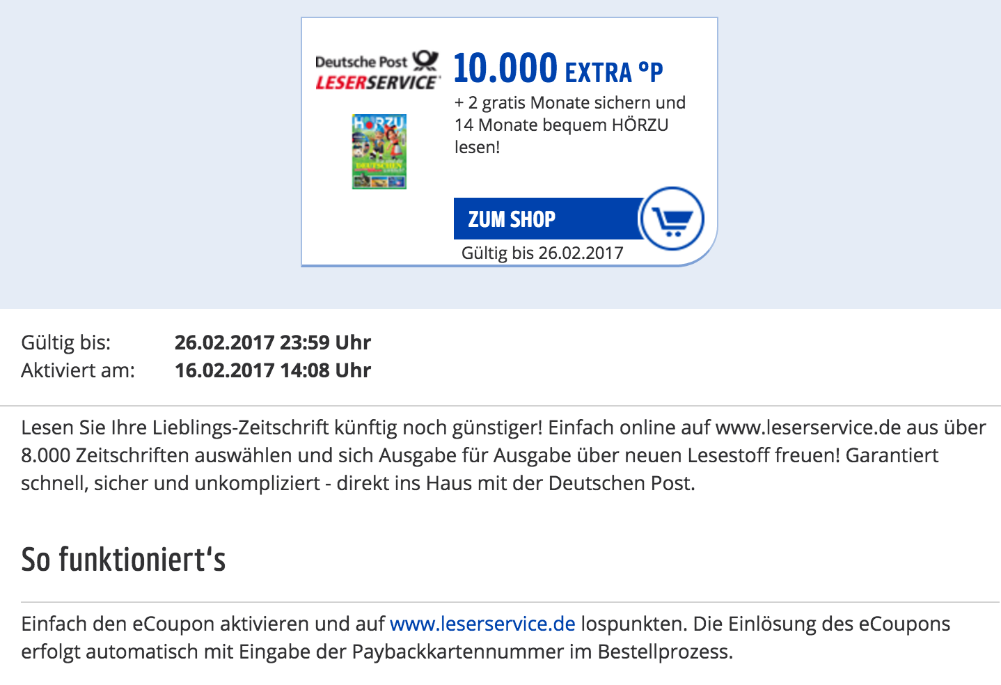 Wenn du den eCoupon nicht in deinem Payback Konto hast, kannst du dir beim Leserservice trotzdem ganz easy noch 9.000 Punkte für ein 12 Monats Abo von HÖRZU (106,60) oder GONG (109,20) sichern.